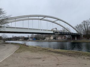 Ce pont routier abrite une piste cyclable et permet la continuité de la rue Lubeck.